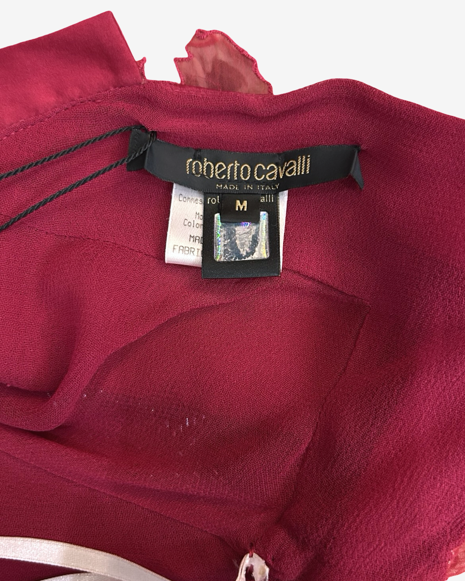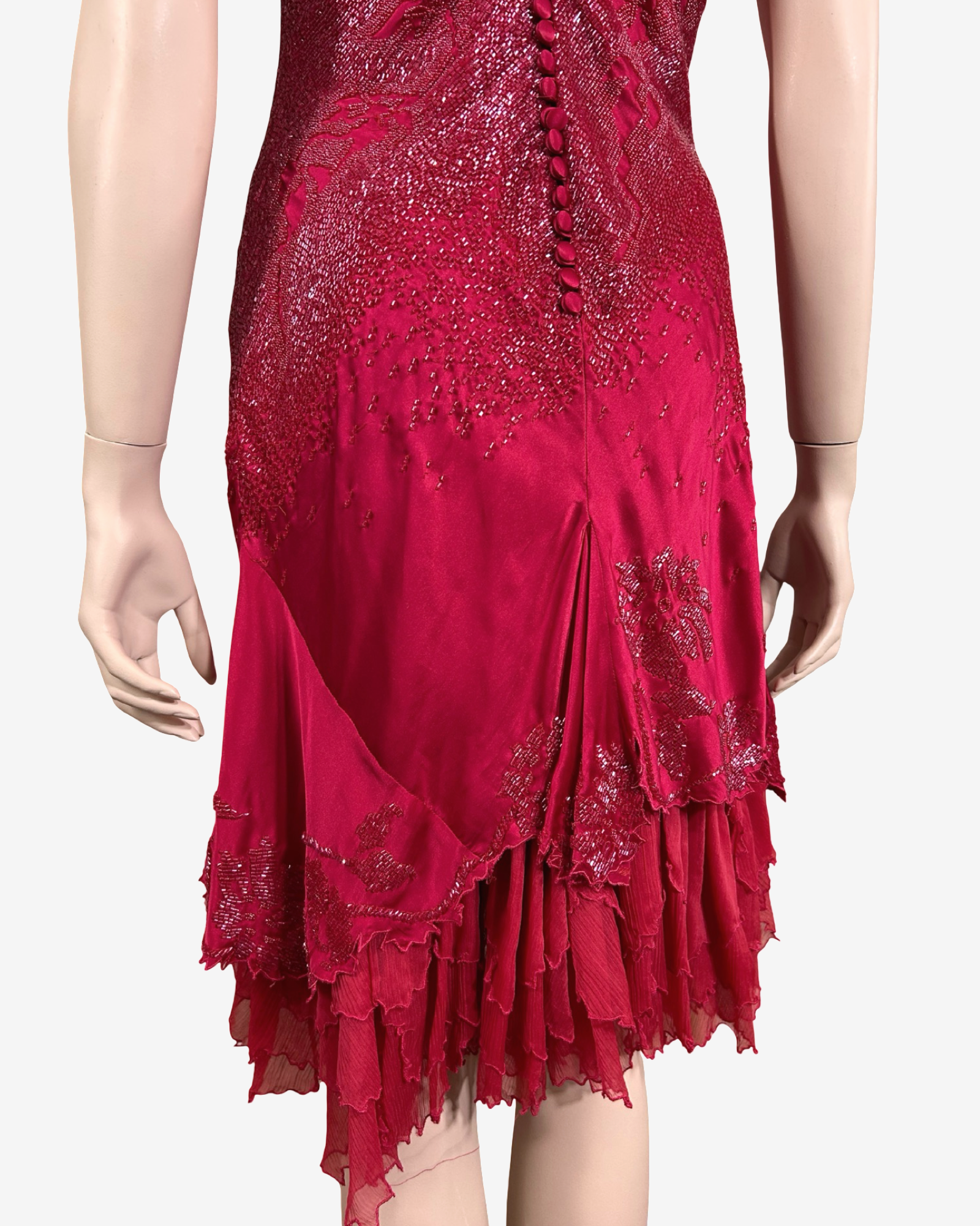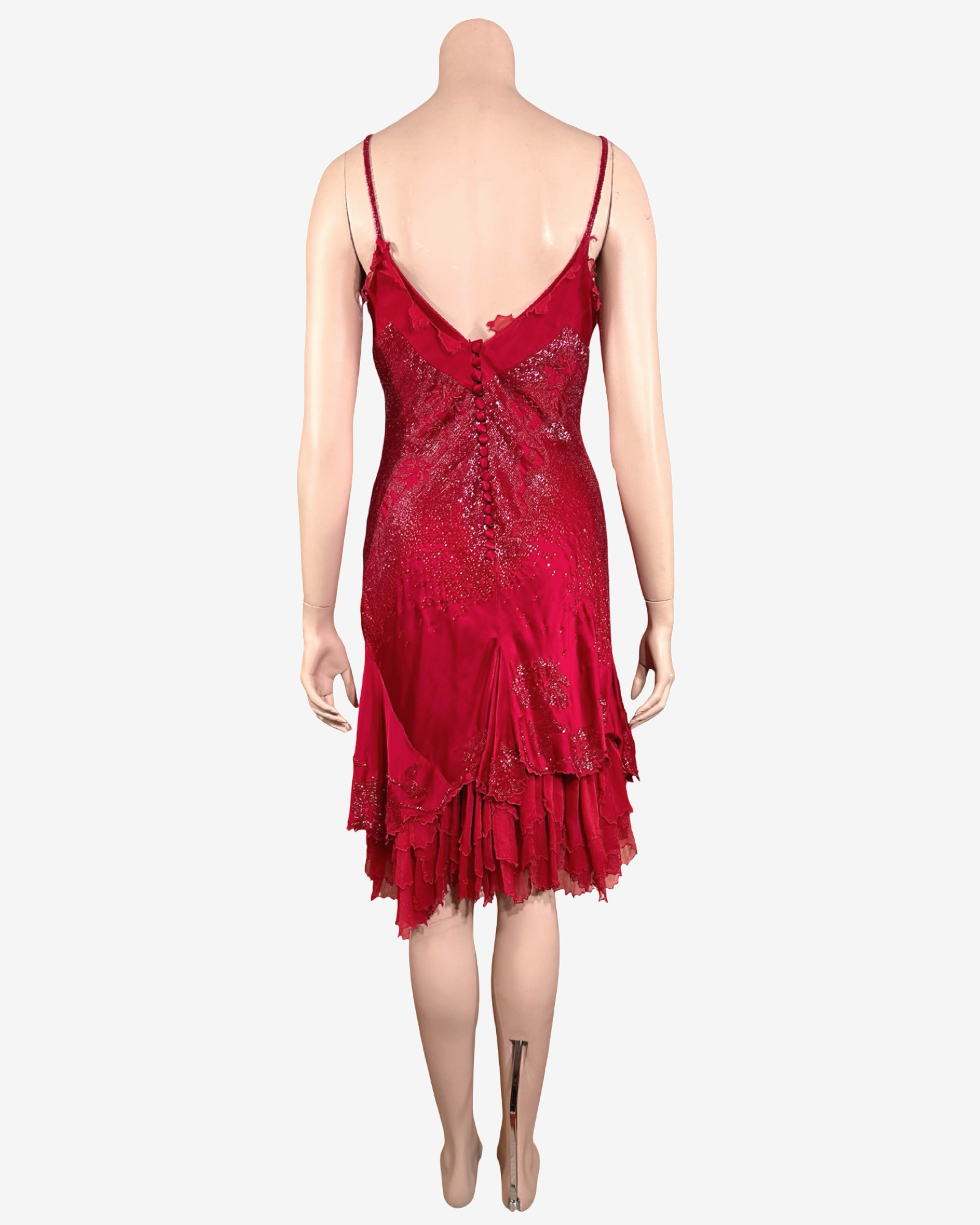 Silk slip dress by Roberto Cavalli in a deep ruby red shade, featuring delicate spaghetti straps and a flattering V‑neckline. The fitted bodice is enhanced with tonal lace and intricate floral beading that continues throughout the dress, adding subtle shimmer and texture. Cut on the bias for a fluid, body‑skimming silhouette, it falls to a layered, ruffled hem in semi‑sheer silk that creates soft movement with every step.