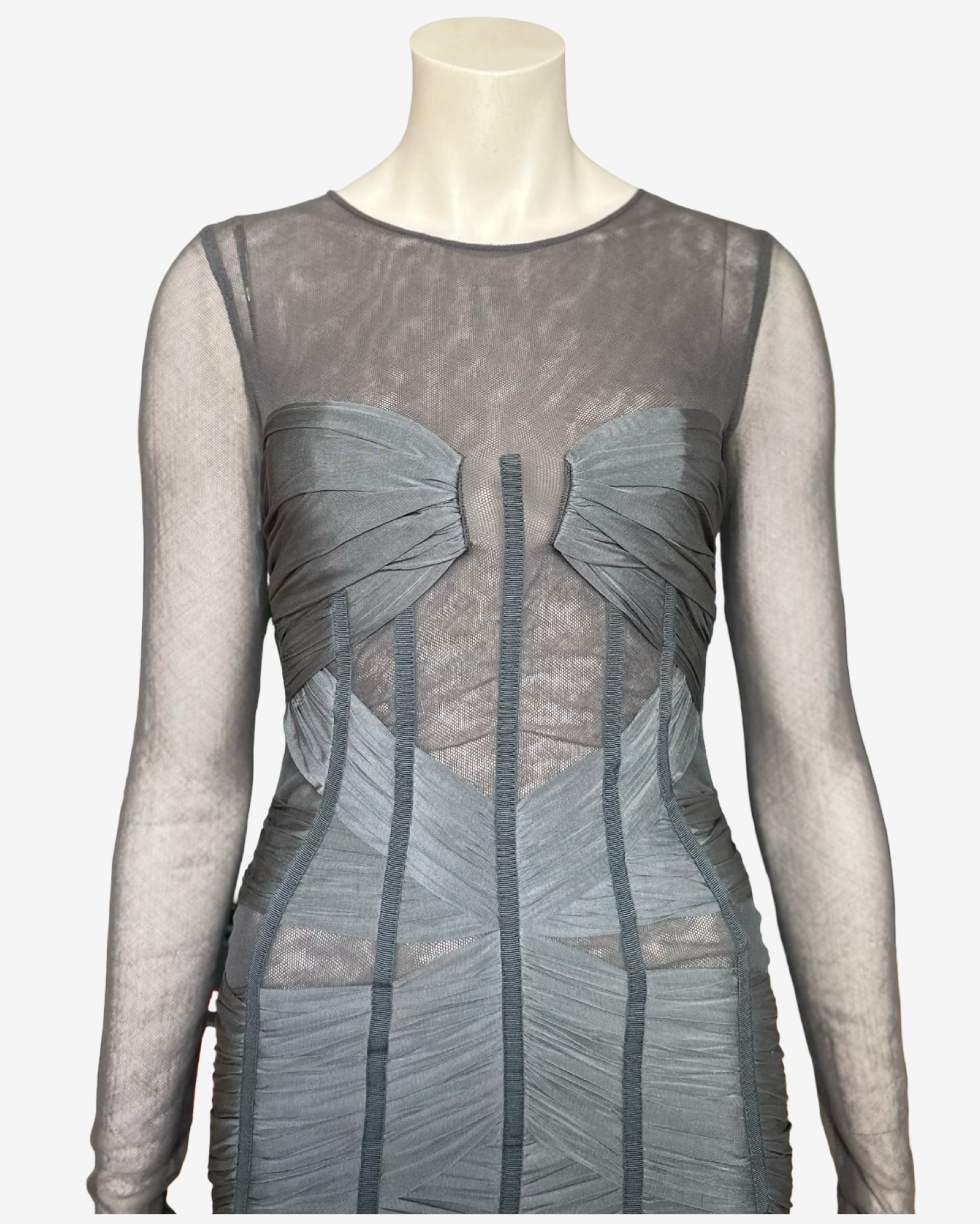 The design showcases a sheer silk mesh yoke and long sleeves that contrast with a heavily structured bodice.