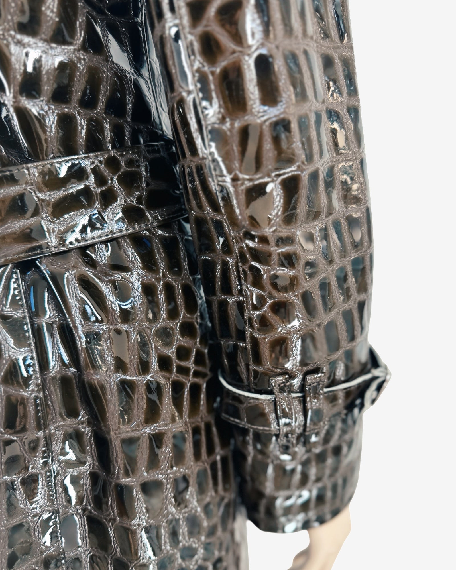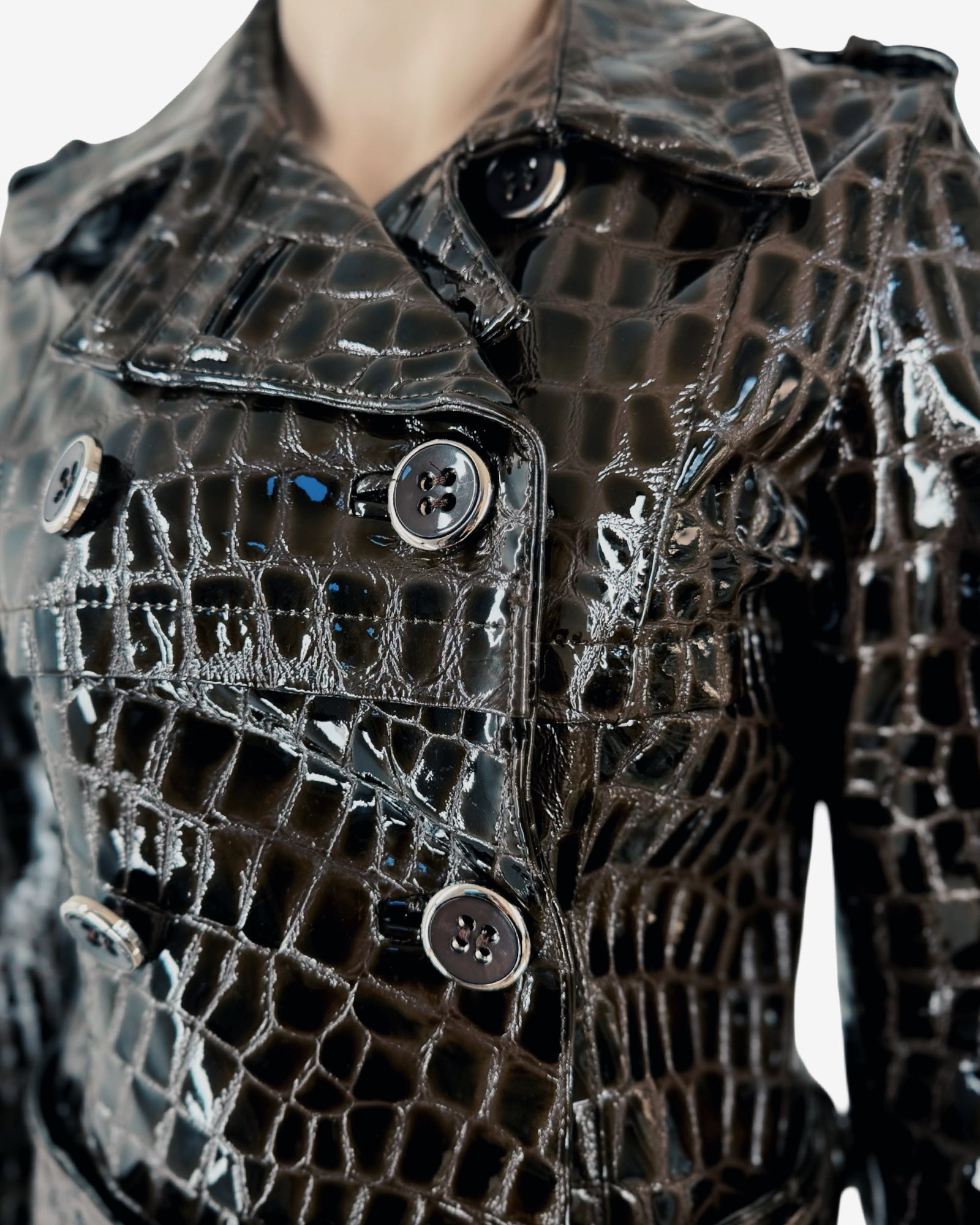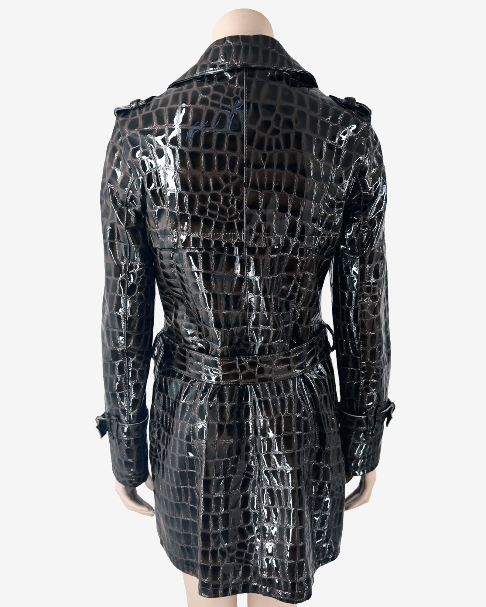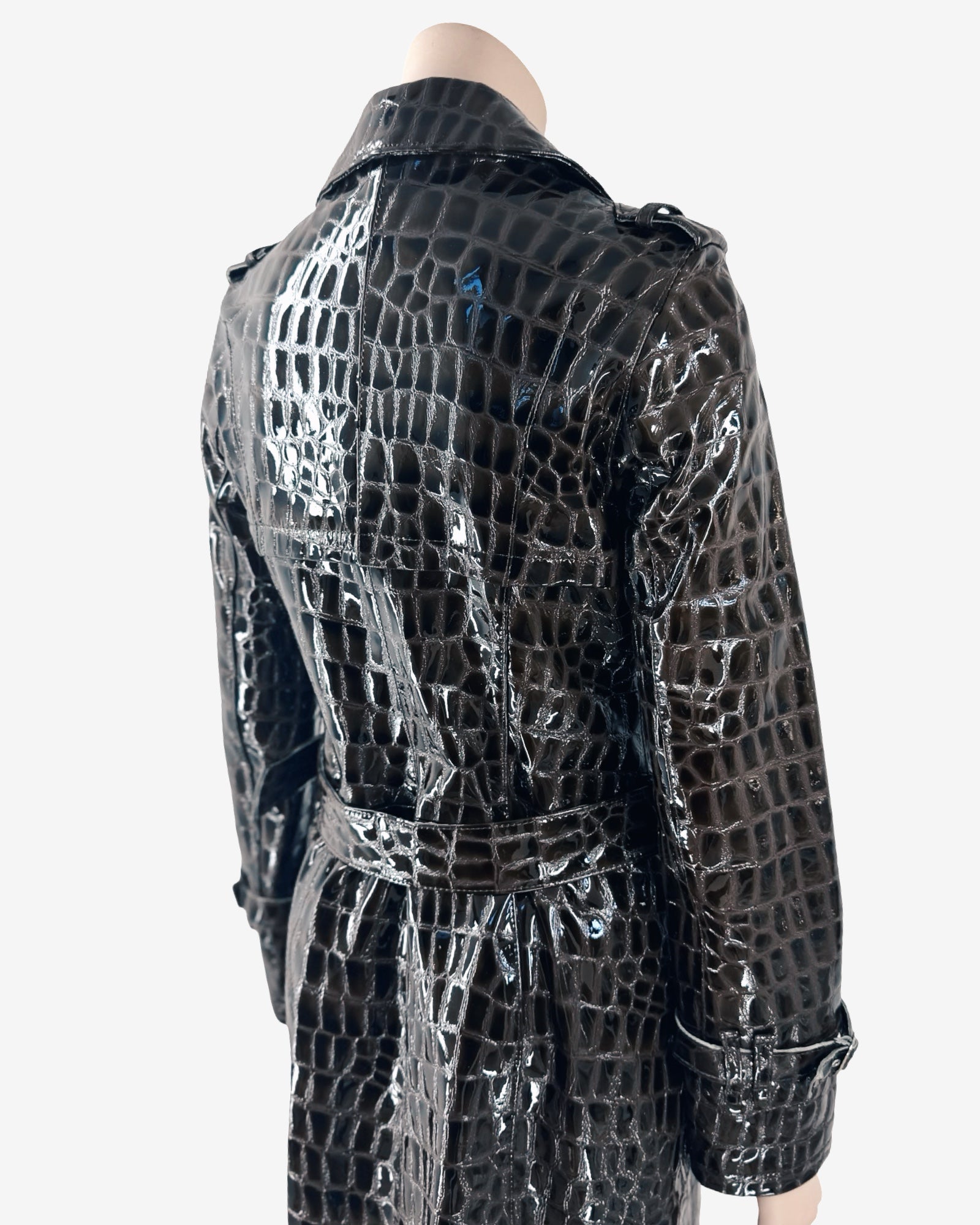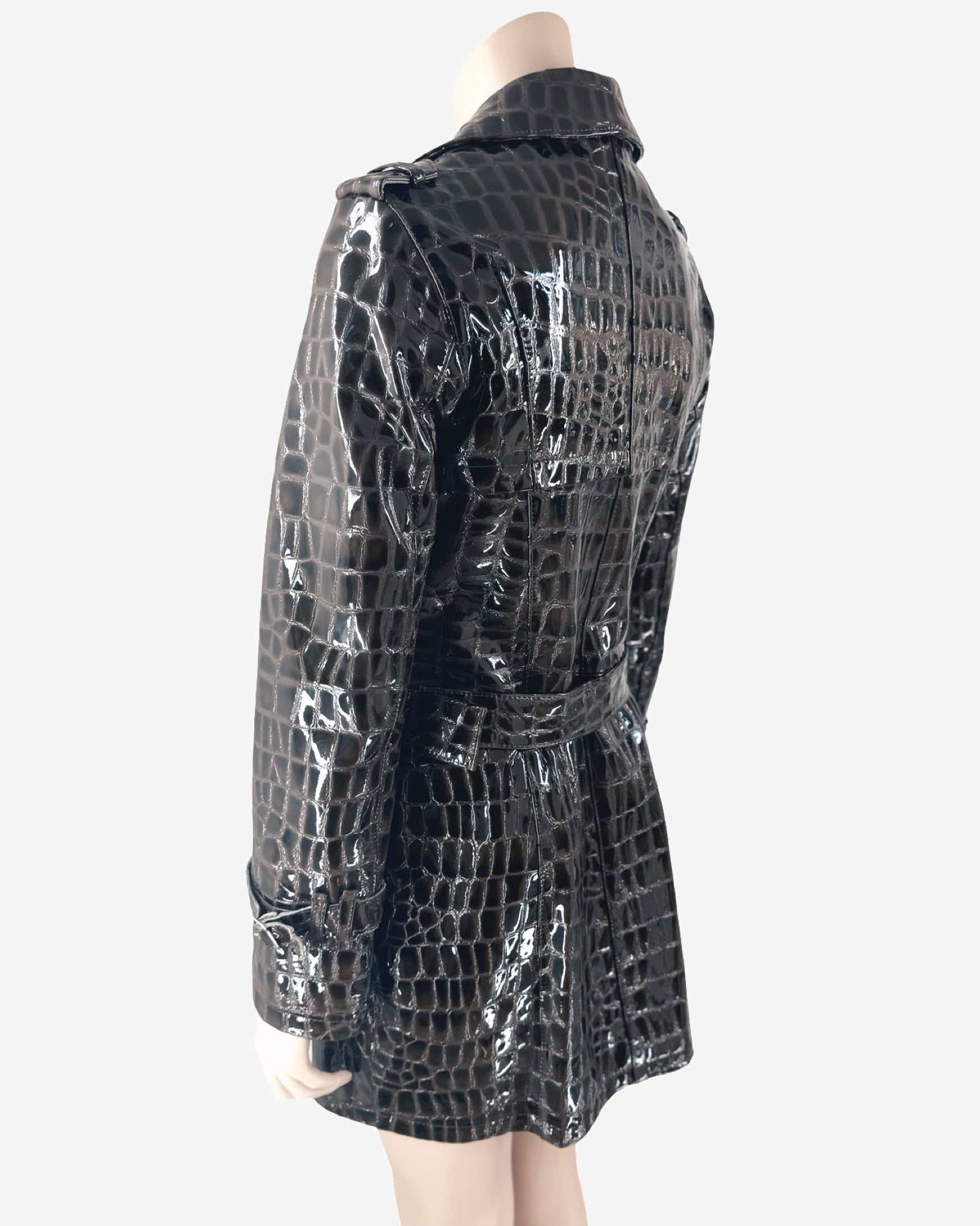 This striking 90s vintage trench coat is crafted from glossy patent leather, embossed with an exquisite crocodile pattern for a sophisticated, high-shine finish. Its distinctive texture and lustrous sheen make it a true collector’s statement piece, perfect for elevating any wardrobe with a touch of luxurious nostalgia.