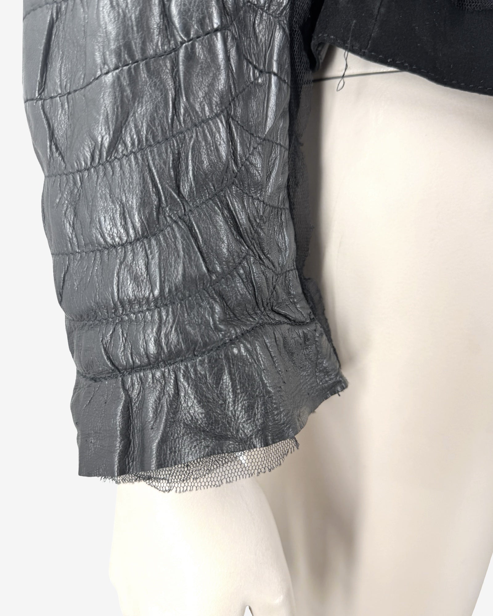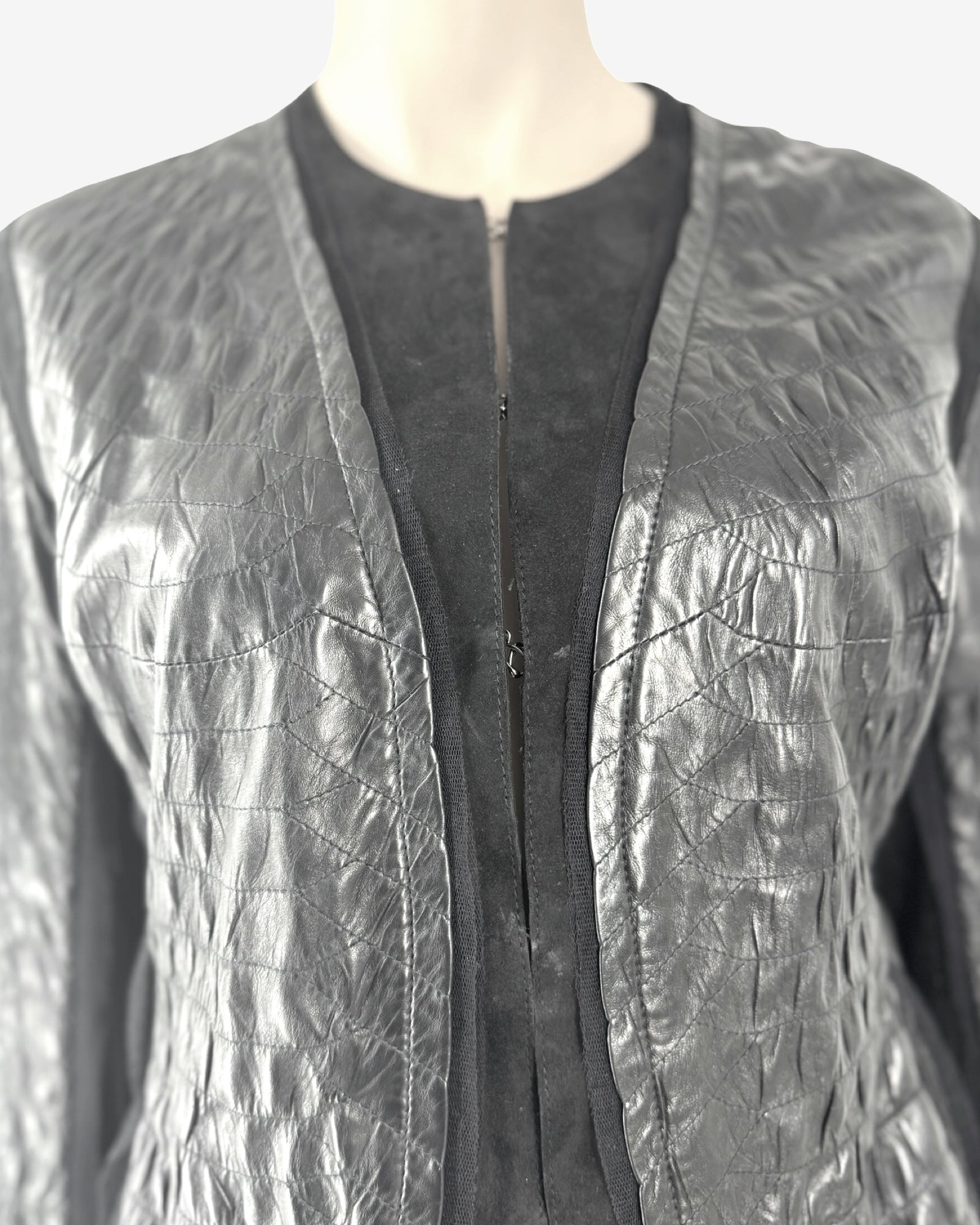 Elegant and distinctive, this Roberto Cavalli leather jacket embodies the designer’s bold aesthetic from the early 2000s. Crafted from premium black leather with a naturally crinkled, textured finish, it features a flattering fitted silhouette, a sleek collarless neckline, and a concealed front closure.