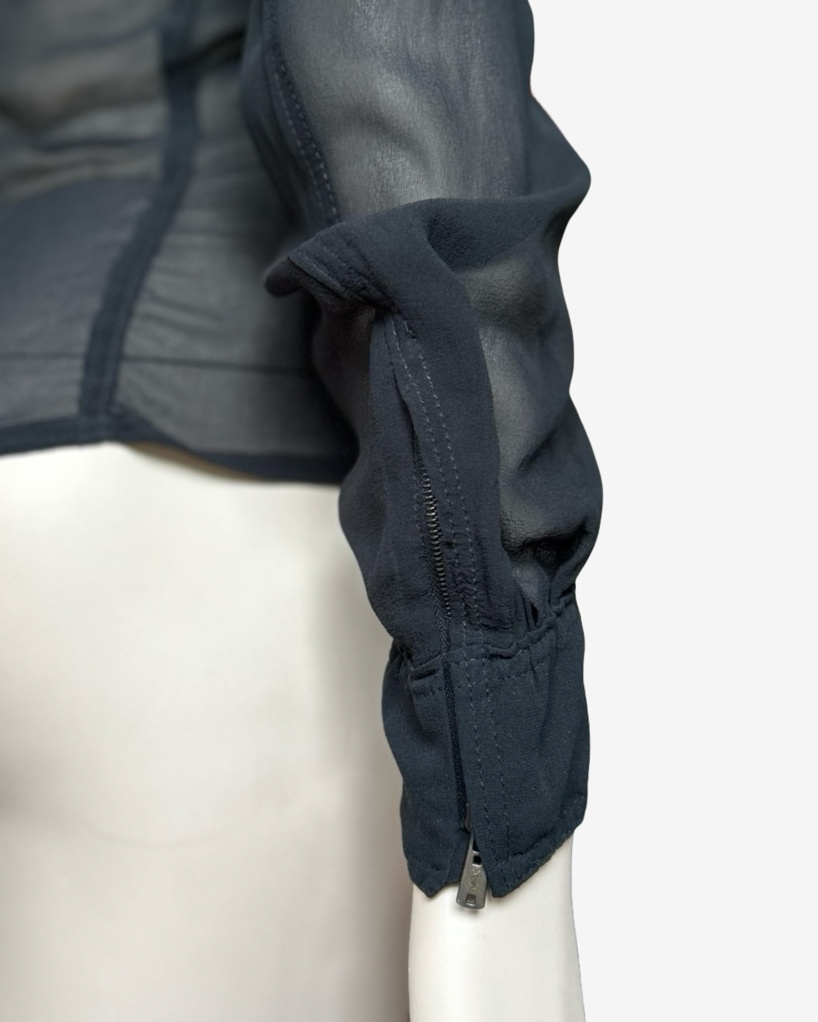 The semi-sheer long sleeves contrast with the structured body, creating a subtle play of transparency and emphasizing the tailored silhouette.